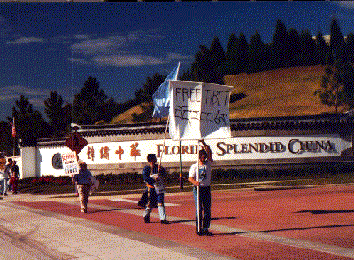 Free Tibet banner-man and demonstrators at Main Gate of Splendid China