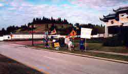 | Despite the crackdown on the freedoms of Christian and other religious activities in the People's Republic of China, the park implies, through the wreaths on the gate and the Christmas tree inside the park, that somehow Christianity is accepted. Again, the truth is diluted. There was no security presence, there were no cars going into the park, so the demonstration moved along Formosa Gardens Blvd towards the Potala Palace exhibit. |