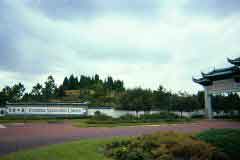 | Main Gate of Florida Splendid China on 12/19/98 Please compare the pictures from the different years. Look closely at the shubbery and the hill behind the name on the wall. | |