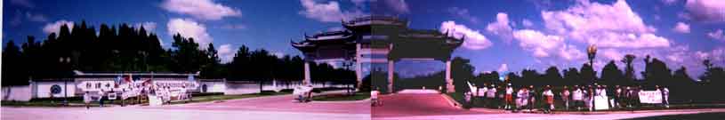 At the corner of Formosa Gardens Boulevard and US-192, just two miles from Disney World, the demonstrators set up long lines down both sides of the dragons that mark the entrance to Florida Splendid China. As thousands of cars passed and read signs such as "Free Tibet", "One China-One Taiwan", "Free Inner Mongolia:, "Free Eastern Turkestan","Communist Chinese Propaganda has NO Place in Florida's Schools", "Genghis Khan was not Chinese" and others in English and Chinese, many people honked their horns and shouted in support of the demonstrators.