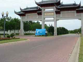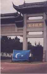 Due to the recent arrival of the largest Eastern Turkestan flag south of the Mason-Dixon line, members hoisted the flag high in front of the largest Chinese-style gate in the US. Dedicated to the memory of the five men who were executed for hanging the same flag from the statue of Chairman Mao in their city of Kashgar, Eastern Turkestan (CNN, AI, UAA) in June 1997.